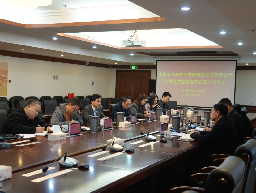 2026年1月8日上午,湖南金和贵矿业有限责任公司等四公司实质合并重整案财产和营业事务交接仪式,在郴州市中级人民法院隆重举行。法院、管理人天地正律师所、债权人、投资人等出席交接仪式。
