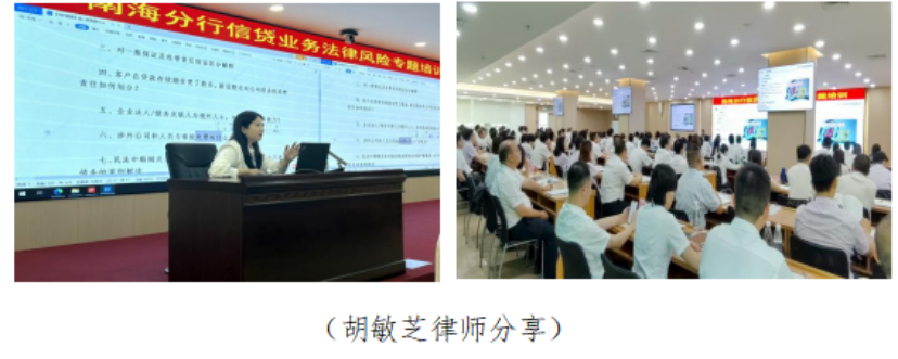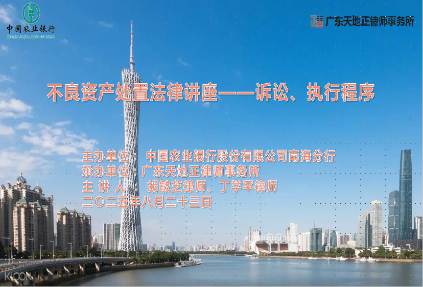 2025年8月23日下午,天地正律师所应邀为南海农行开展《不良资产处置法律讲座》。其公司业务部、普惠金融部、个人金融部、合规部以及各支行风险经理及骨干约170人参加。天地正律师所执行主任丁学平律师、副主任胡敏芝律师主讲。