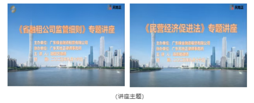 2025年9月16日上午,天地正律师所应邀为广东绿金融资租赁有限公司开展法律讲座。其公司领导及业务员工40余人参加。天地正律师所副主任胡敏芝律师、金融公司部部长冯晓明律师主讲。